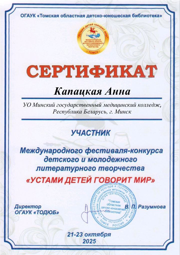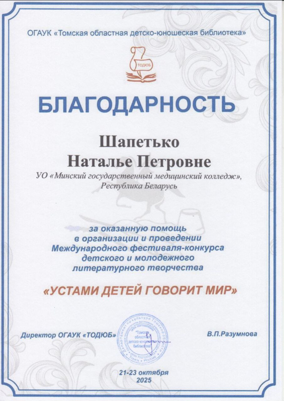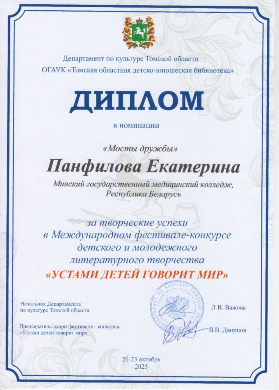 Учащиеся колледжа под руководством преподавателя Шапетько Н.П. в октябре 2025 года приняли участие в Международном литературном фестивале- конкурсе "Устами детей говорит мир"
