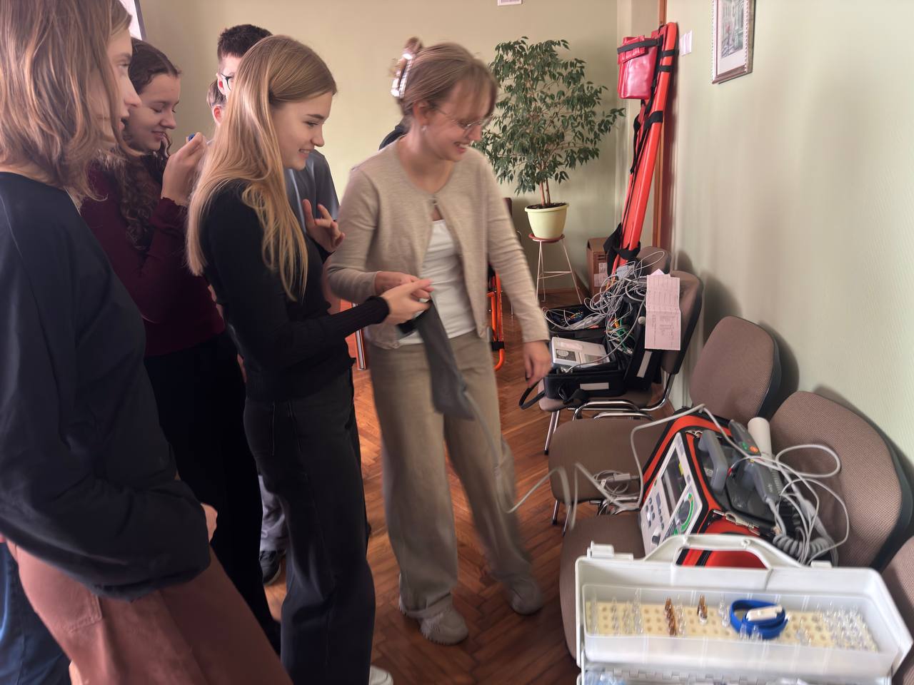 Знакомство с оборудованием: Школьники увидели, как устроена настоящая реанимация на колесах — от системы подачи кислорода до дефибриллятора.