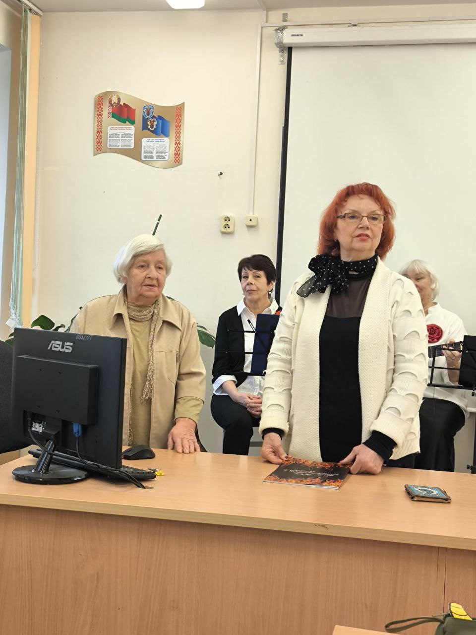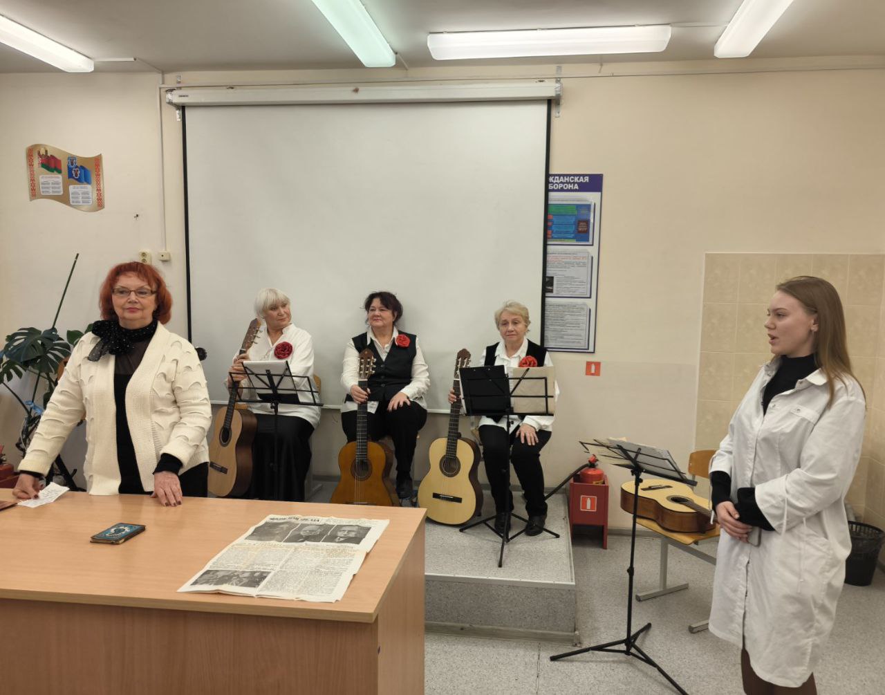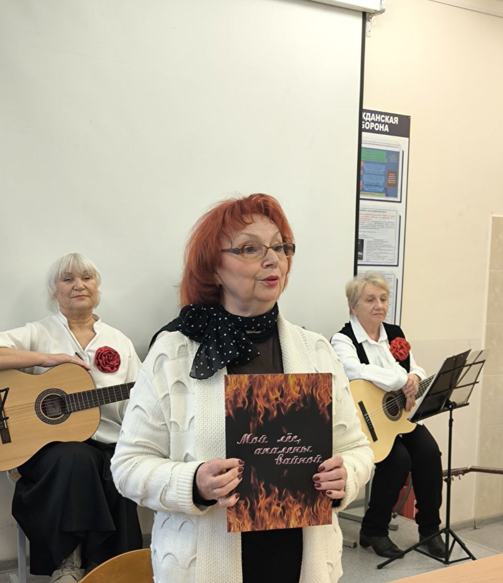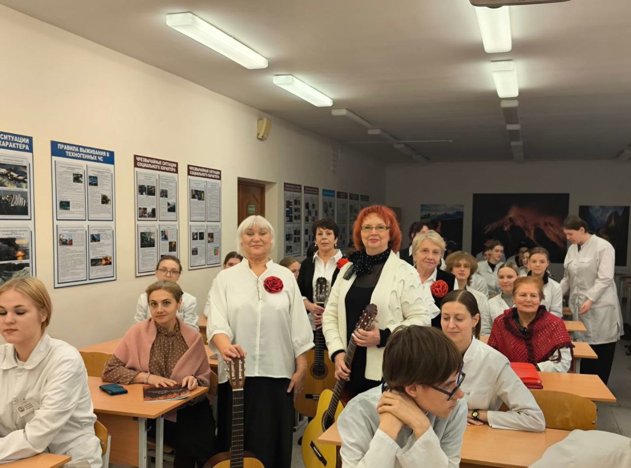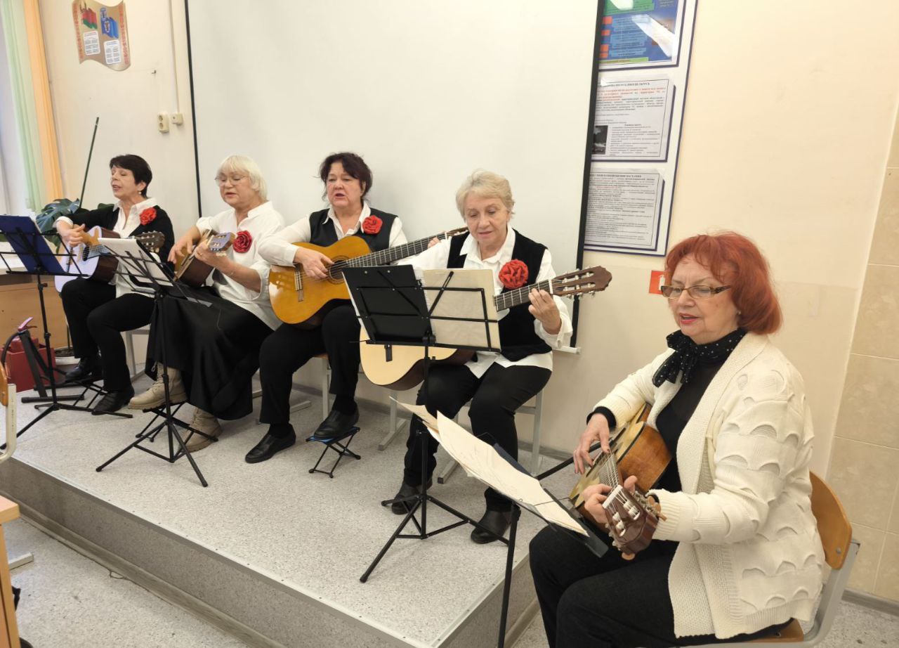 21 ноября в Минском медицинском колледже состоялось встреча с Пожаевой Альбиной Ивановной, представителем ветеранов ВОВ Партизанского района г. Минска, Бровцыной Аллой Александровной, членом совета ветеранов, Черновец Зинаидой Владимировной, малолетним узником и с ансамблем гитаристов ТЦСОН Партизансконо района г.Минска "С песней на струнах" в составе Бровцыной Аллы, Калюк Елены, Дицевич Людмилы, Лемех Таисии, Новицкой Татьяны. Гости колледжа выступили с презентацией книги " Мой лёс, апалены вайной" и подарили присутствующим музыкальные номера.